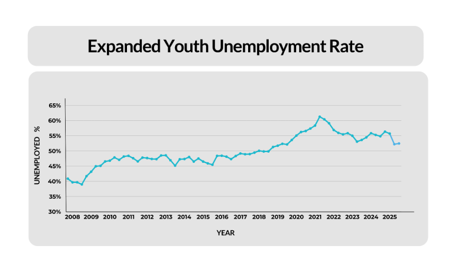 Looking at the data from a youth lens, young people continue to have the highest unemployment rates. For youth aged 18-35 years, the broad unemployment rate remained relatively constant at 52.43%, with the number of NEET youth remaining stable at 8.8 million. Despite this, the number of employed young people declined by almost 100,000 jobs. Youth employment declined without a mirroring increase in unemployment due to the fact that a number of young people (147,000) left the labour force completely.